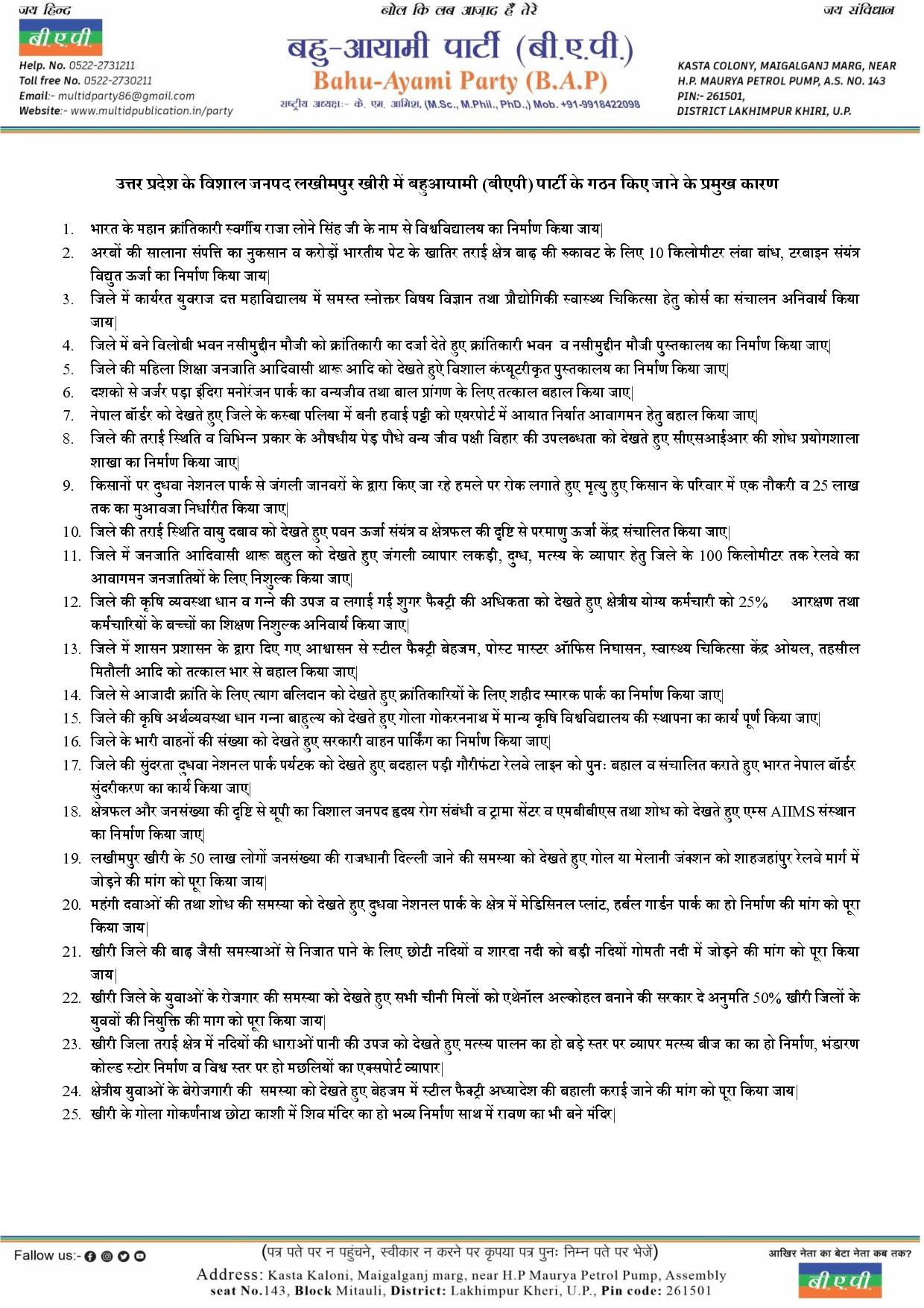 उत्तर प्रदेश के विशाल जनपद लखीमपुर खीरी में बहुआयामी (बीएपी) पार्टी के गठन वकए जाने के प्रमुख कारण